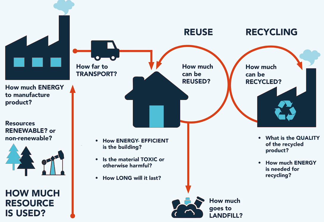 Energy, carbon, and/or toxicity of all the inputs and outputs of a product should be considered over its lifetime, from extracting the raw materials to manufacturing, processing, transportation, and installation on site.